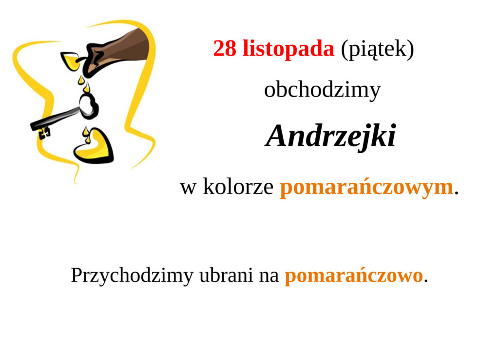 28 listopada (piątek) obchodzimy w przedszkolu ANDRZEJKI. Przychodzimy ubrani na pomarańczowo.