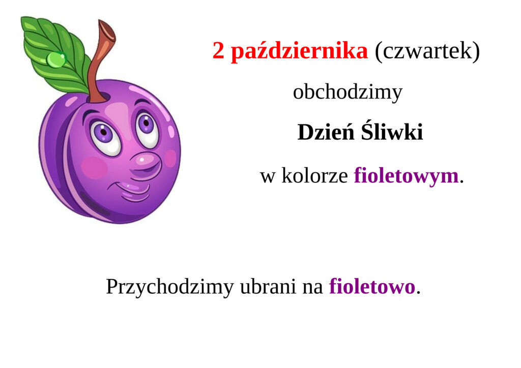 To święto ma na celu zaznajomienie dzieci z wartościami odżywczymi śliwki i promowanie zdrowego stylu życia. Przychodzimy ubrani na fioletowo.