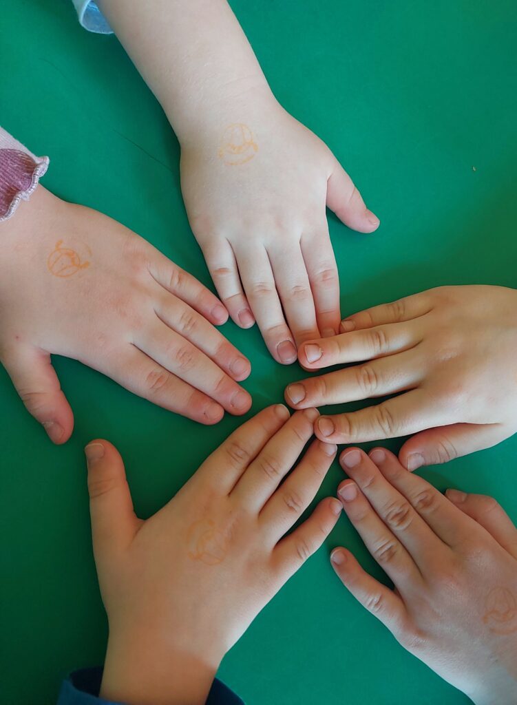 1. Nasza grupa utrwala zasady dbania o zdrowie, biorąc udział w programie PrzedszkolaBezOwsików.pl. Dzieci z zaangażowaniem zdobywają wiedzę m.in. dzięki wesołej pieczątce „Owsik Wiercipiętek”, którą po zabawie obowiązkowo zmywają przed posiłkiem.