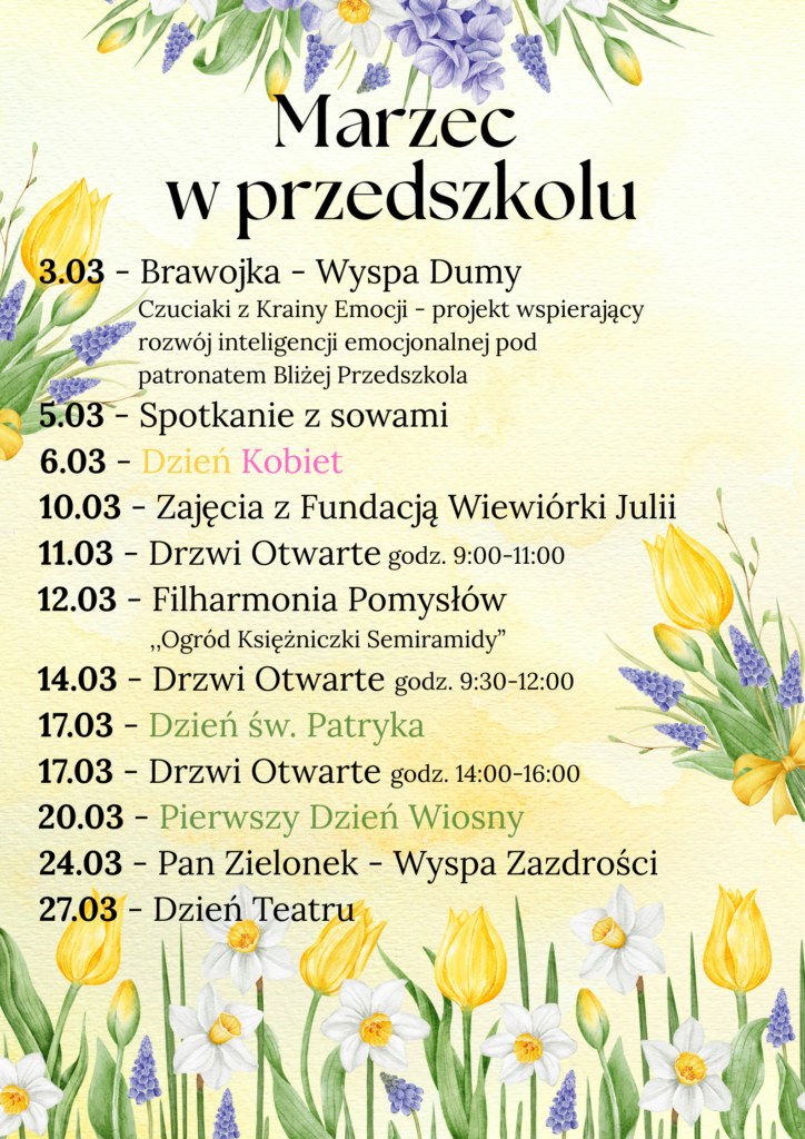 - pobyt w ogrodzie przedszkolnym (uzależnione od warunków pogodowych)